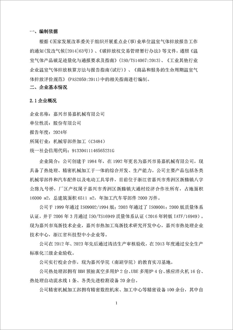 嘉興市易嘉機械有限公司溫室氣體排放報告(2024年度)